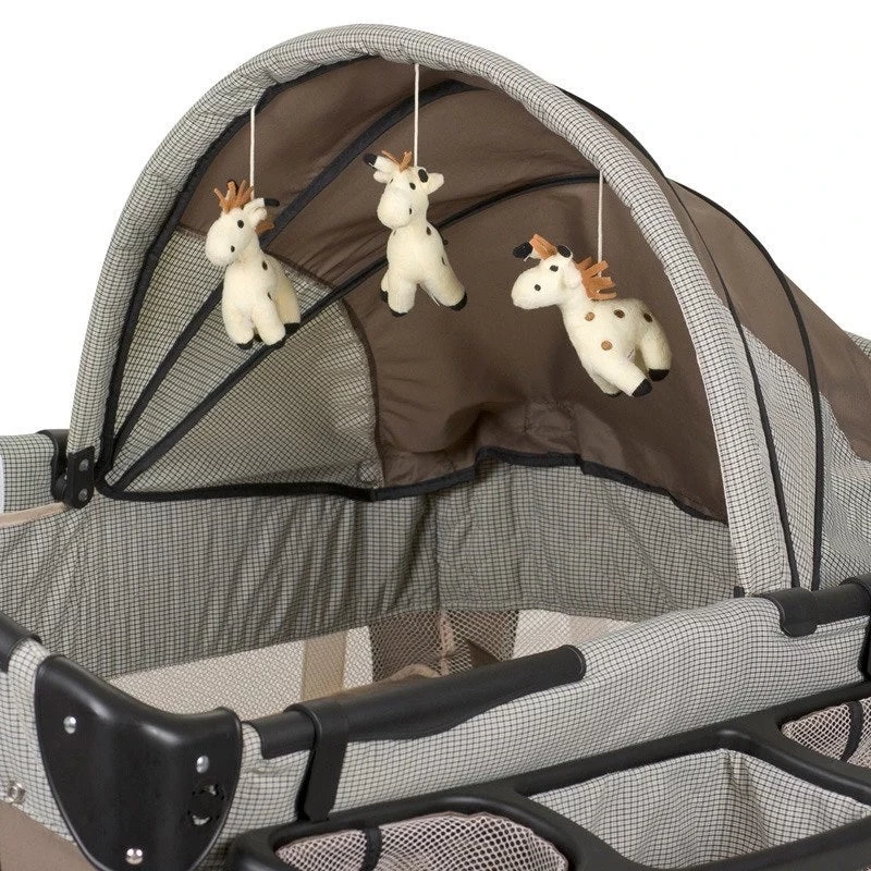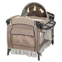 The Baby Trend® Deluxe Nursery Center in Havenwood is feature-rich and keeps your baby comfortable and entertained whether used in the home or on the go! Additional features includes: Removable full-size bassinet and canopy, flip-away changing table, one-hand locking mechanism, parent organizer, toy/storage pocket, large wheels with brakes, travel/storage tote bag, easy compact fold, electronic music center with volume control, and nightlight, and music center includes two styles of music and nature sounds.
