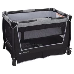 The playard includes a removable full bassinet, changing table, a deluxe parent organizer. Easy one-hand locking mechanism makes the playard stable and it can be moved from place to place with large wheels and secured with brakes. Also included is a convenient travel/storage tote bag. Your baby will enjoy the electronic music center with volume control, nightlight, and vibration which includes two styles of music and nature sounds.