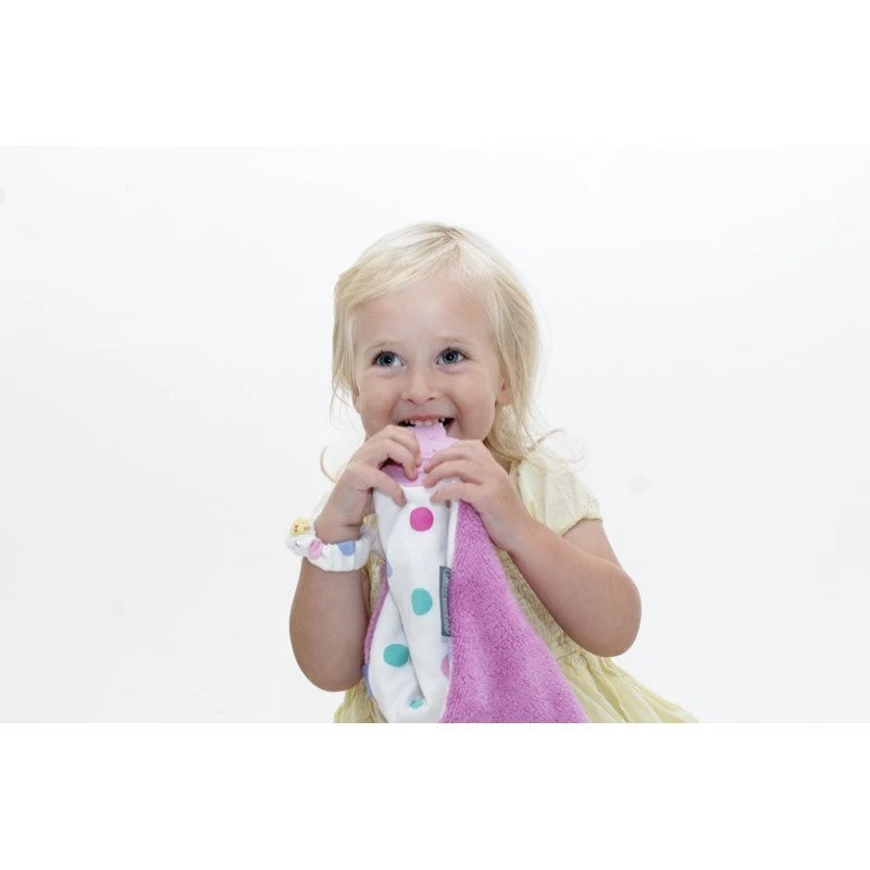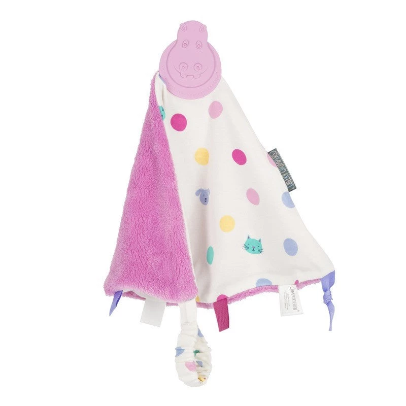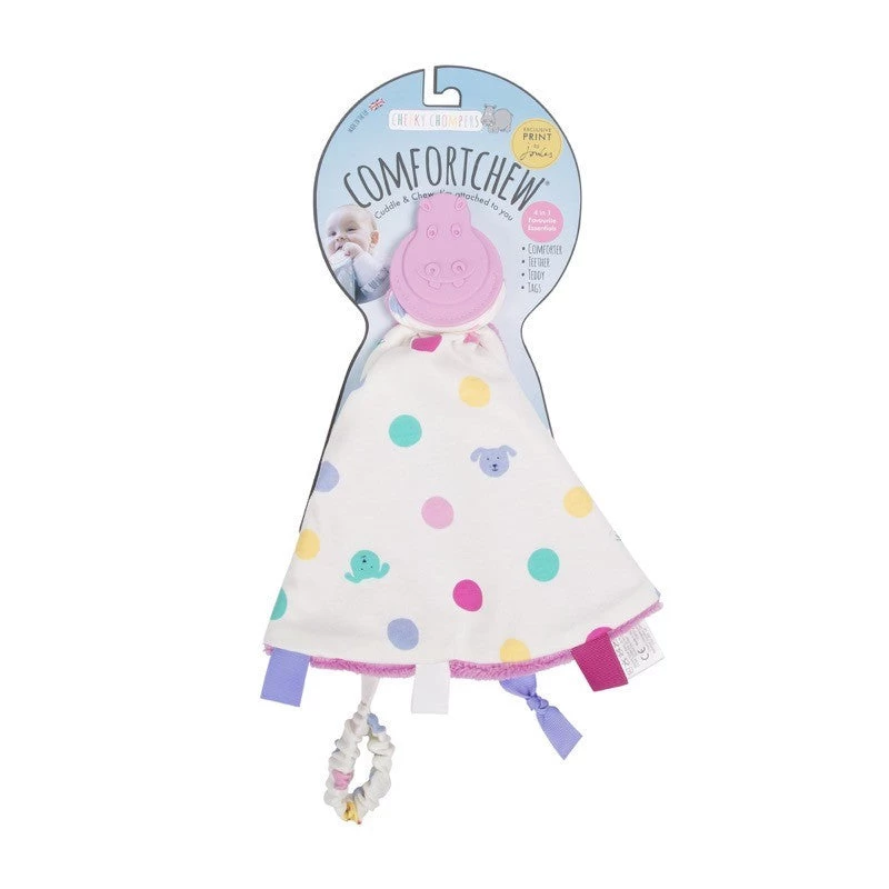 Comfortchew is an attached teething comforter with different textures to stimulate babies & soothe tender gums. It brings together baby’s favourite essentials -Comforter, Teether, Tags, Knot & the feel of their favourite teddy. Made from super-soft jersey cotton, cuddle fleece & ribbons, it is highly absorbent & can attach to the baby, cot, car seat, buggy and dummy. No more dropped teethers!