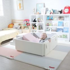 Designskin bumper mat can transform to various usages with combinations of 4 functions of a bumper mat, bed, playard and playmat from 0 to 7 years old. The one size bumper mat is suitable for any home or commercial playground.Â