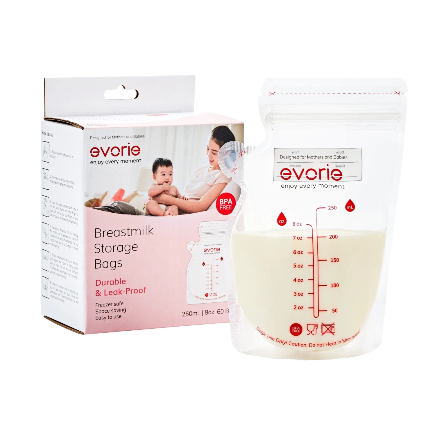 Evorie Premium Breast Milk Storage Bags are BPA-free, FDA approved and European Food-grade certified. It is uniquely designed to ensure that precious breast milk is not spilled, wasted or contaminated.