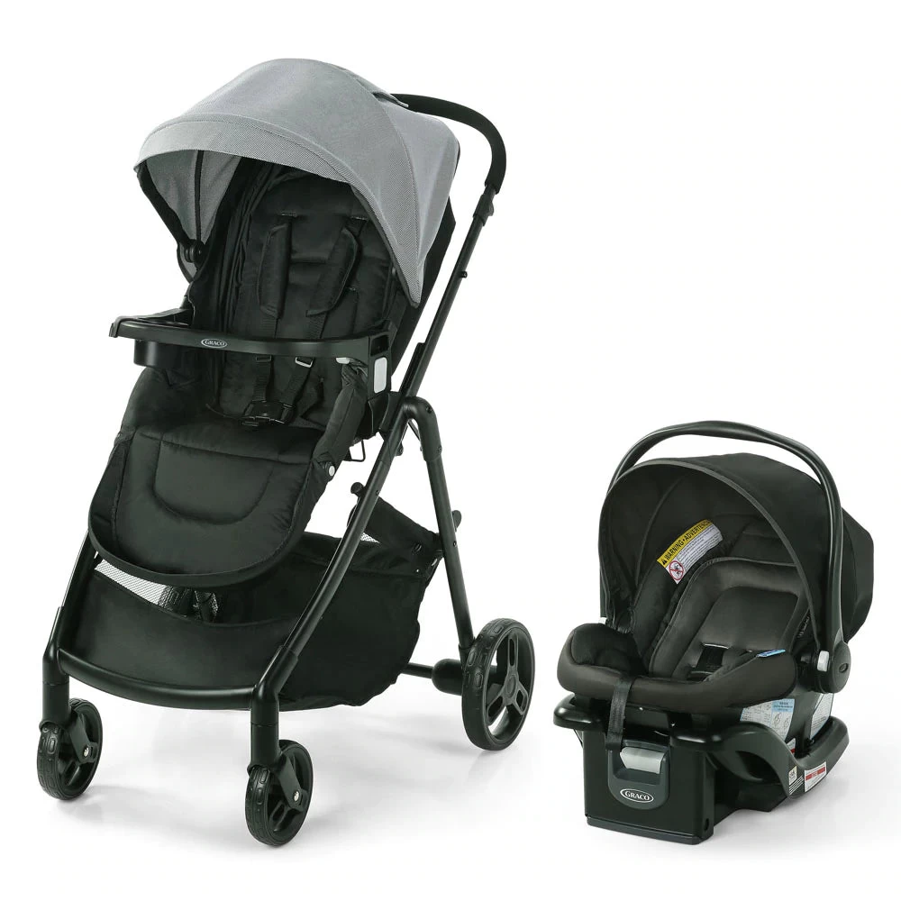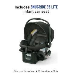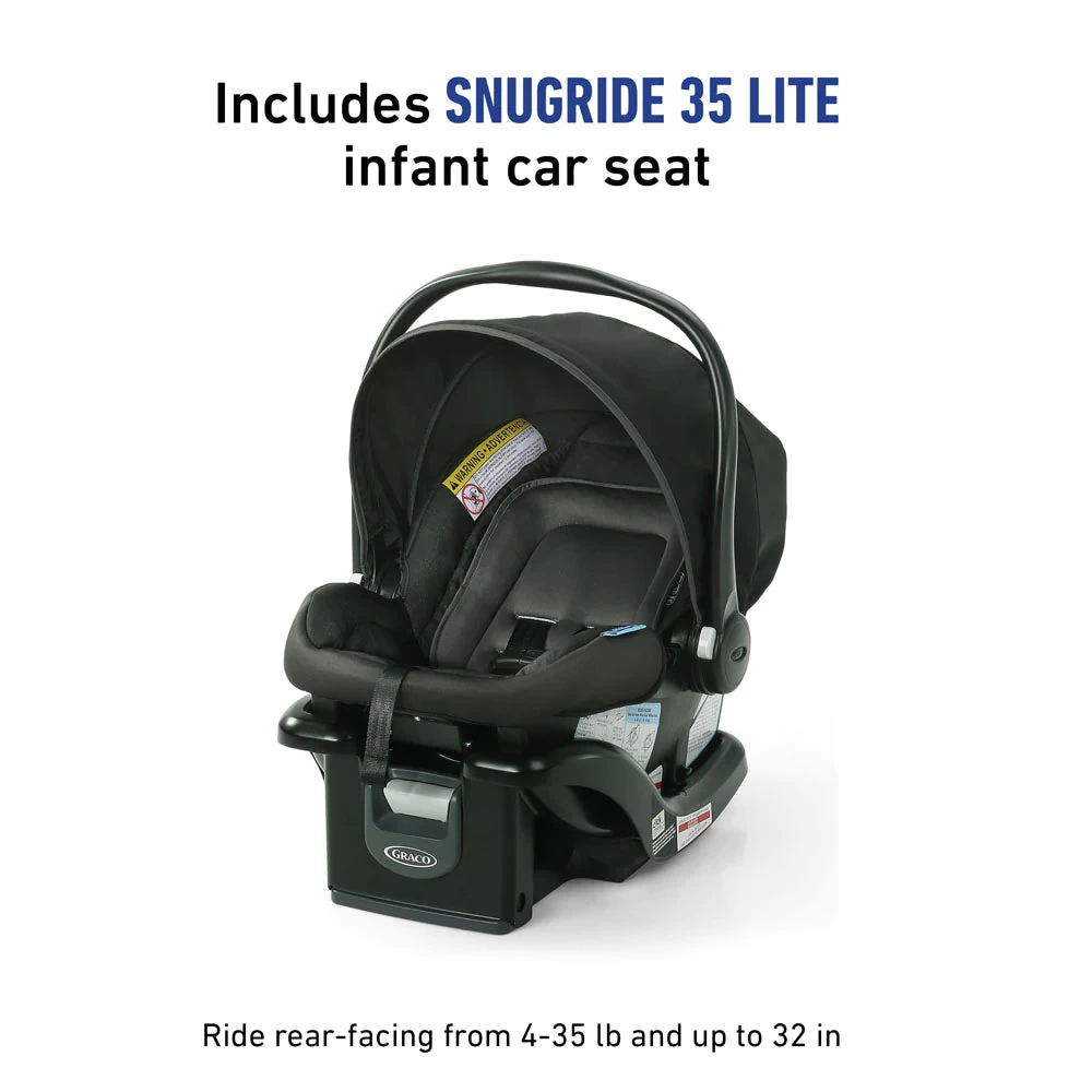The travel system includes the Graco® SnugRide® 35 Lite Infant Car Seat, rear-facing from 4-35 lb, for seamless transition from car to stroller.