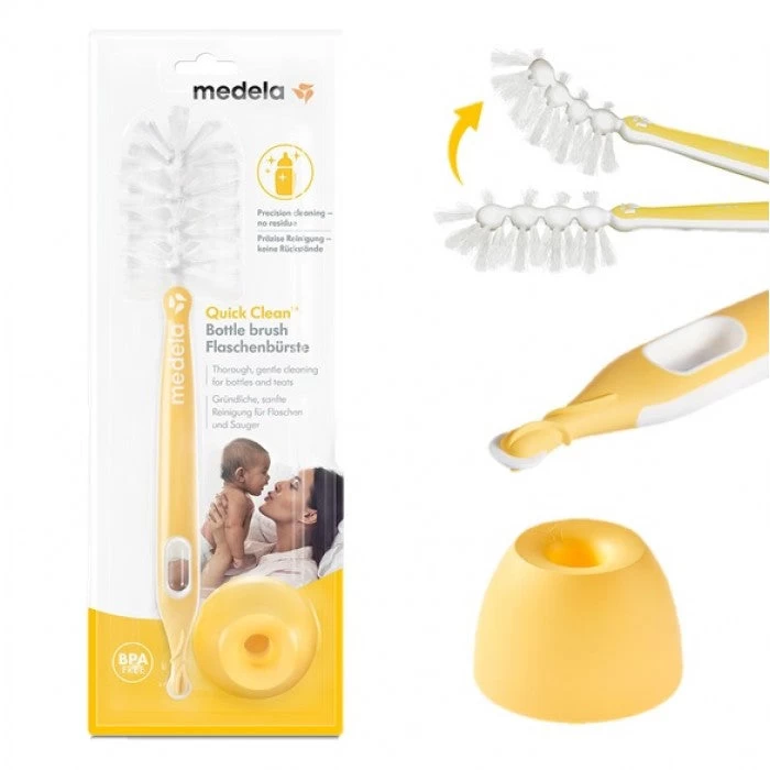 If you’re pumping and feeding your baby expressed breast milk, it’s really important to wash your breastfeeding accessories, such as breast milk bottles, after use (and sanitise them once a day) to make sure they’re clean and safe. Specially designed for baby bottles, teats and breast pump equipment, the Medela Quick Clean™ Bottle brush makes it easy to keep everything clean. The flexible brush head with 180° bristles reaches every nook and cranny, so no milk is left behind. Plus, it has a handy teat cleaner that’s cleverly ridged to remove residue from tricky spots in baby bottle teats.
