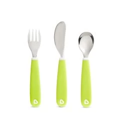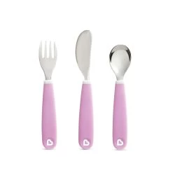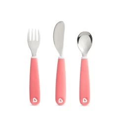 Self-feeding is a multifaceted milestone. Once they feel comfortable enough to eat on their own, they need to master using utensils, too! Nudge them in the right direction with Splash™ toddler flatware. Designed especially for little mouths and hands, this fork, knife and spoon set brings self-feeding up a notch with comfy, easy-to-grip handles and an array of fun colors to choose from. Toddlers will love eating like grown-ups at the dinner table, and because these kid-friendly utensils were created with their safety and size in mind, they’ll embrace independent eating with ease. Hooray for that!