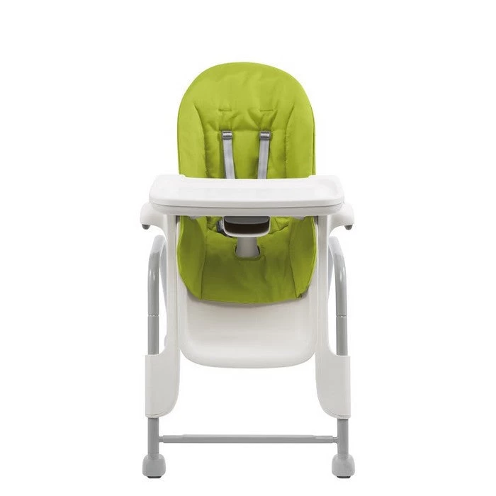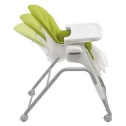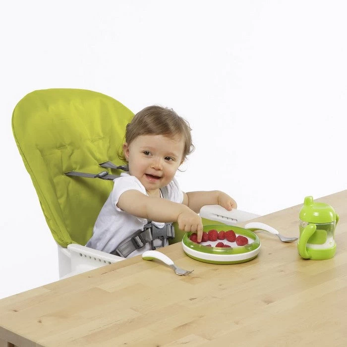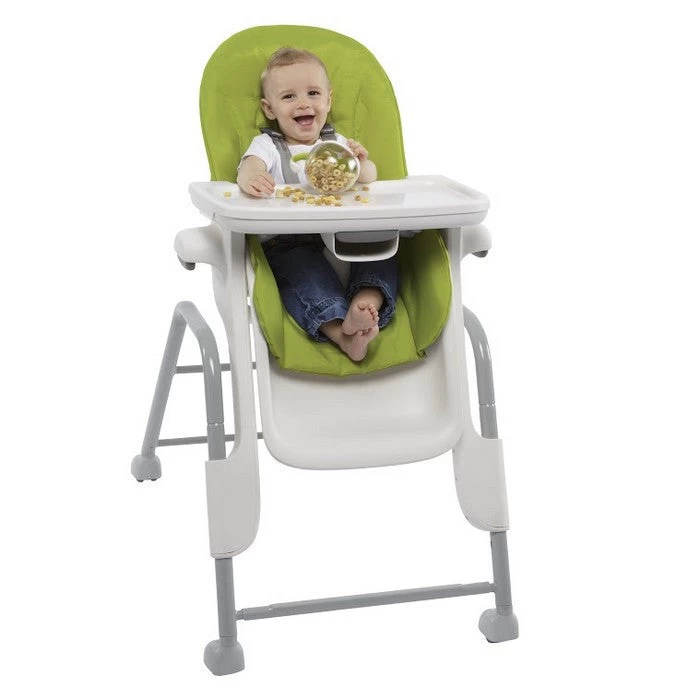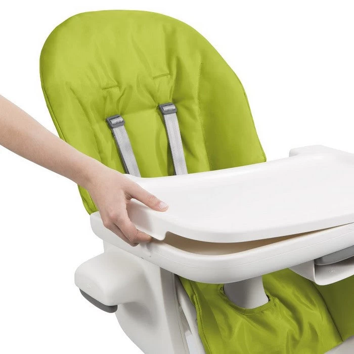 Tray is easy to remove with one hand and rests flat on the table, leaving the other hand free for baby