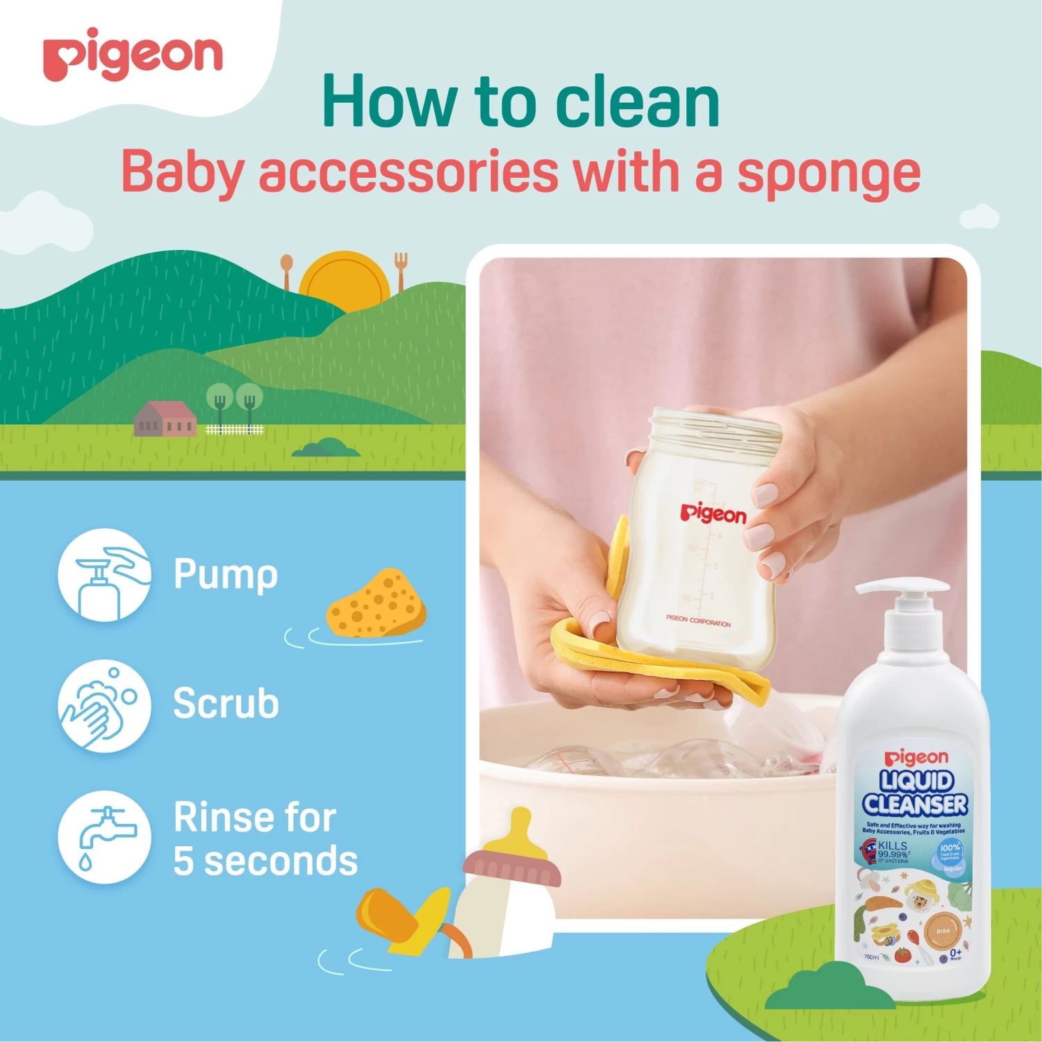 Cleaning – Clean Feeding Bottles, Nipples/Teats, etc. by pouring the cleanser directly onto the washing sponge.
