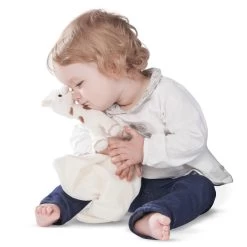 The perfect companion throughout the day! With the help of her tail, Sophie holds a sweet embroidered comforter! Light and easy to grasp, it’s the perfect companion for cuddling times and bed time. Made of two very sweet textiles for variation of touch feeling. Contrasting coloured spots over Sophie la girafe’s body, makes it easy for baby to recognise his comforter amongst his other toys.Â
