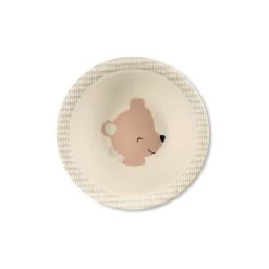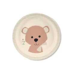 A set of tableware made of bamboo with a print of Baylee the bear. The set includes a plate, bowl, cup, fork, and a spoon.